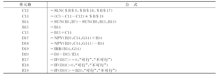 第二步:利用Excel中的SLN 函数、NPV 函数、IRR 函数和IF 函数计算C12、D17、D18、D19、D20、E17、E18以及E19单元的值。