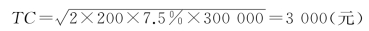 其中,公司全年承担的机会成本为:(40 000÷2)×7.5%=1 500(元);公司全年承担的转换成本为:7.5×200=1 500(元)。两者总计为3 000元,这一结果与上述计算结果一致。