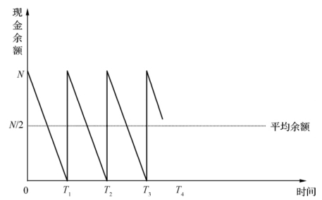 在图8-7中,假设企业0时点持有现金N 元,由于现金流入的速度小于现金流出的速度,在T1时点企业的现金余额下降为0,此时企业通过出售N 元的有价证券补充现金。随后,当现金余额在T2时点再次下降为0时,企业再次出售价值N 元的有价证券,循环往复。