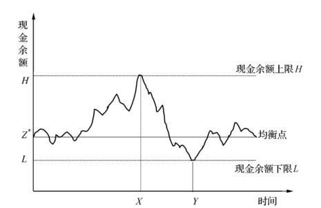 图8-8说明了米勒-奥尔模型的基本原理。该模型是建立在对控制上限(H)、控制下限(L)以及目标现金余额(Z*)这三者进行分析的基础之上的。企业的现金余额在上、下限间随机波动,在现金余额处于H和L 之间时,不会发生现金交易。当现金余额升至H 时,比如说点X(上限),则企业购入H-Z*单位(元)的有价证券,使现金余额降至Z*。同样地,当现金余额降至L,如点Y(下限),企业就需售出Z*-L 单位(元)的有价证券,使现金余额回升至Z*。这两种情况都是使现金余额回到Z*。