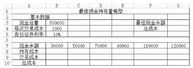 选中A8:G10单元格区域,然后在菜单栏选择“插入→图表”出现向导,可按向导完成图标的制作。将图表类型设置为“折线图”,将系列产生的方式设置为“行”,在“系列”选项卡中将B7:G7单元格区域作为分类X 轴标志。将图表标题设置为“现金持有量成本分析”。