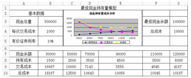 已知某企业的现金需求总额T=500 000元,每次交易成本b=1 000元,有价证券利率r=10%,现在假设企业有以下6种现金余额:30 000元、50 000元、70 000元、90 000元、110 000元、120 000元,企业要求最低现金持有量为28 000元。请根据这些数据来设计最佳现金持有量模型并绘制出相应的分析图。