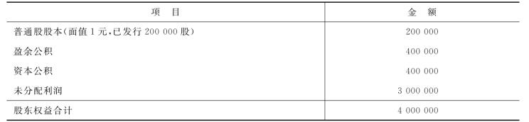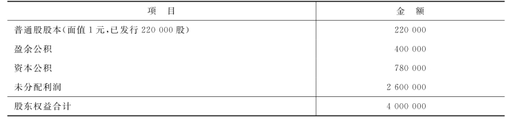 【例9-3】 某企业在发放股票股利前,股东权益情况如表9-1所示。假定该企业宣布发放10%的股票股利,即发放20 000股普通股股票,现有股东每持100股可得10股新发股票。如该股票当时市价为20元,发放股票股利以市价计算。则发放股票股利后的股东权益如何?