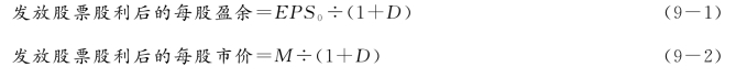 式中,EPS0为发放股票股利前的每股盈余;M为发放股票股利前的每股市价;D为股票股利发放率。