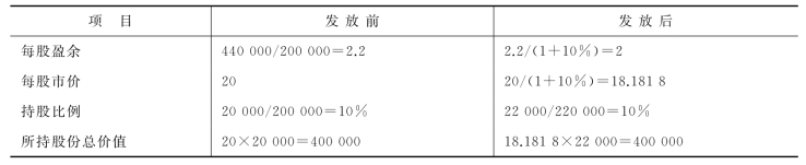 【例9-4】 假定上述企业本年盈利440 000元,某股东持有20 000股普通股,则发放股票股利对该股东的影响如表9-3所示。