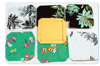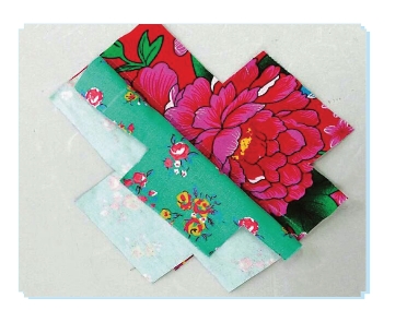 1.图3—7:根据纸样,裁剪6片大小一样的正方形布片,颜色可以是两两对称,也可以6片颜色都不一样。