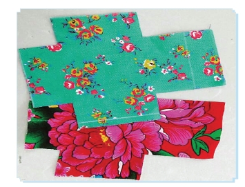 2.图3—8:先分别把四块正方形布的一边缝到一块正方形布的四条边上,然后把周围四块布的相邻两边缝起来。