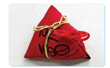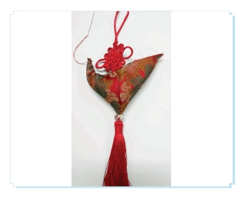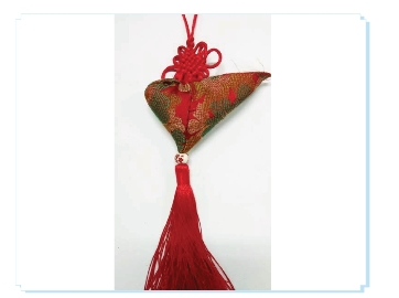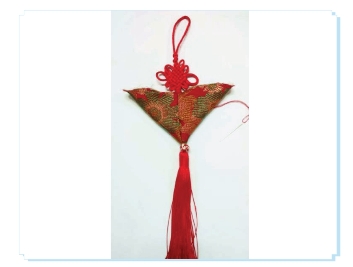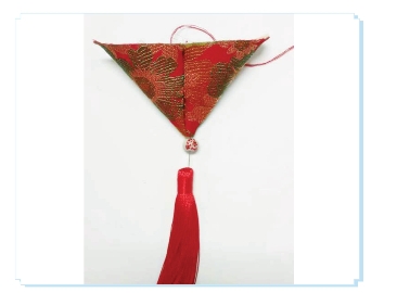 绣有福字的红色织锦缎配上大红如意结,营造出华丽、吉祥的气氛。把作品悬挂在客厅橱窗里,让人心旷神怡。图4—1为粽子香袋。