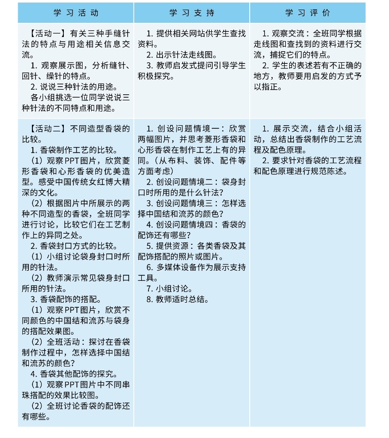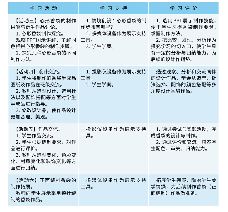 说明:“香袋的制作”是通过对缝针、回针、缲针的复习,引出香袋的制作技术。通过交流、分析、体验等活动,学会从布料、形状、针法、装饰等多角度设计香袋作品,为学生形成设计思路作铺垫。为突破难点“选择合适的针法与返口缝制”,设计了学生作品交流的教学环节,为学生能设计与制作香袋提供了思维的方法。学生通过亲自制作与体验,尝试将三种手缝针法,迁移至各种香袋的缝制中,通过交流与评价,引导学生探究三种针法的特点,有利于学生形成技术思维。