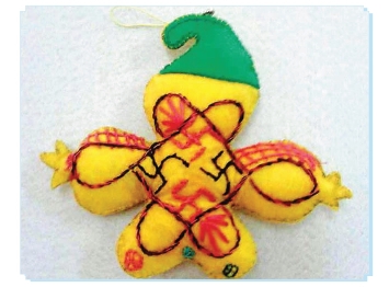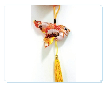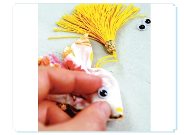 黄色织锦缎、棉线、绳带、玩偶眼睛、流苏、腈纶棉、香料。