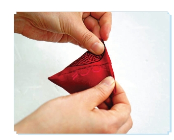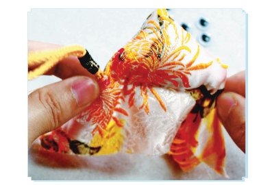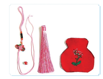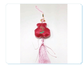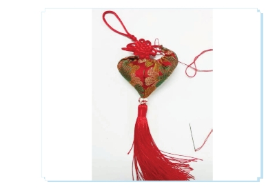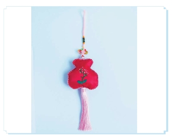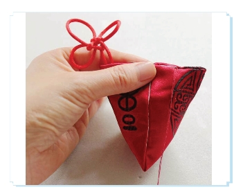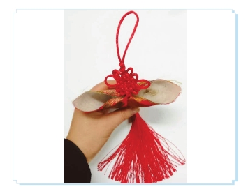 5.图4—41:将中国结和流苏置于福袋下方位置,绳结线穿在流苏中并打结固定。