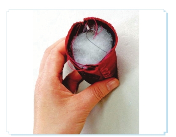 师:对的。填塞粘有香粉的棉花,不能太满。将毛边向内翻,用缝针缝合一边的口,注意不要缝得太稀,否则抽紧后不会有褶子。缝到头上与中央缝合,半个心便成型了。继续缝合另一半,方法同上。