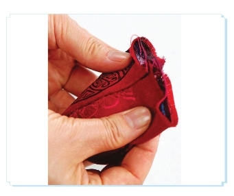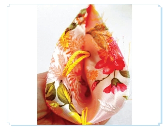 生:因为袋身返口缝制中,一般使用缲针缝制,但心形香袋要进行收褶抽紧处理,所以要使用缝针。