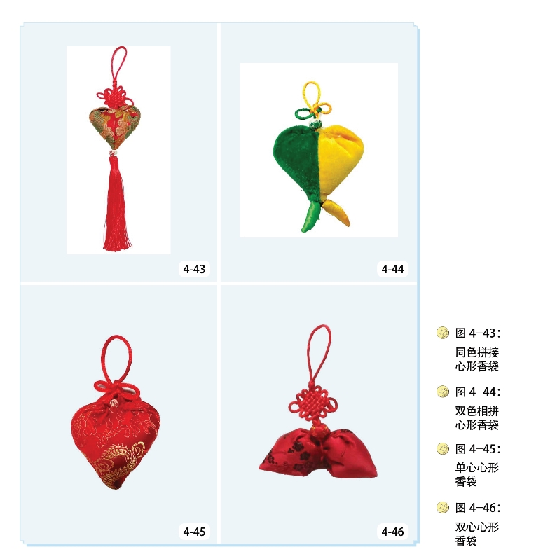 师:看来同学们已经研究出了同色相拼心形香袋的衍生作品的制作方法。其实心形香袋的品种还有很多,等着你们去继续思索和探究。老师只是给予你们一种思维方法,希望在下面的制作中为你们所用。