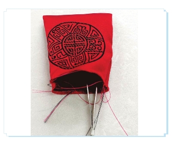 5.图4—15:将中国结放置中央缝合,中国结的两根线头一根在缝合线的左边,一根在右边。