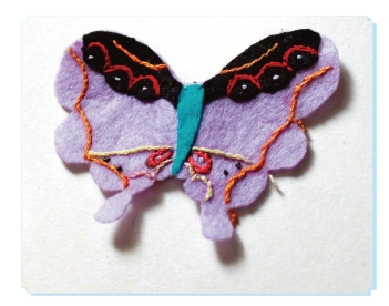 3.图4—30:用缲针固定蝴蝶的身体和翅膀,再用轮廓绣在前片绣出蝴蝶身体的花纹。