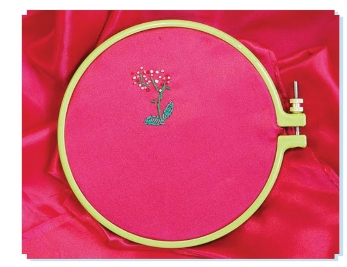 1.图4—37:使用绣花绷架在色丁布上绣图案。