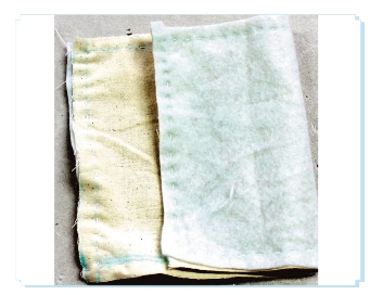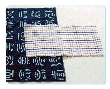 1.图5—15:裁剪20厘米×16厘米扎染布和9厘米×18厘米格子棉布各一块。