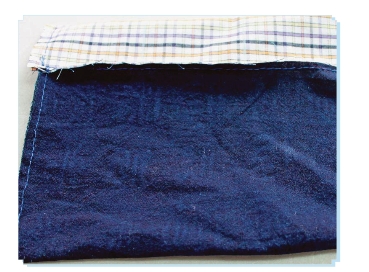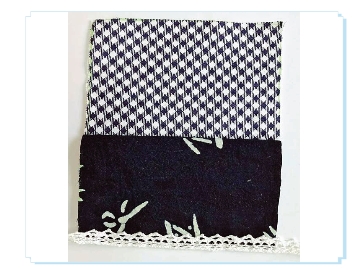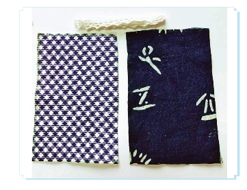 1.图5—10:材料准备:蓝色格子棉布(8.5厘米×13厘米)一块,蓝色扎染布(8.5厘米×13厘米)一块,白色花边一根。
