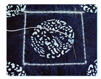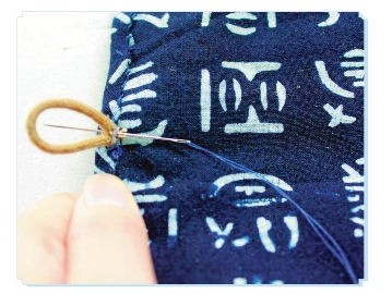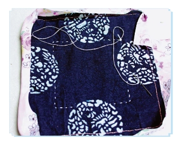 3.图5—17:藏针缝合返口,把袋子扎染布的部分往袋子里塞,至底部。