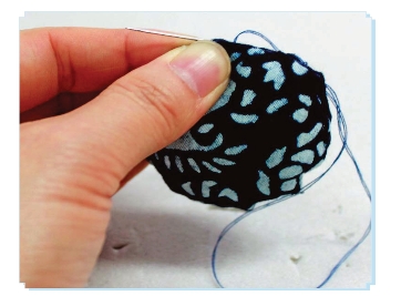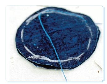 3.图5—22:剪半径为3厘米的圆形扎染布两块,四周留0.5厘米的缝份,沿画好的线平针缝好,预留2厘米宽不缝,作为返口