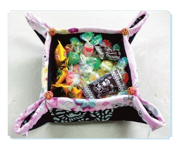 6.图5—7:将每个尖角对折,缝合固定。缝上糖果珠子,其他3个角同样操作。