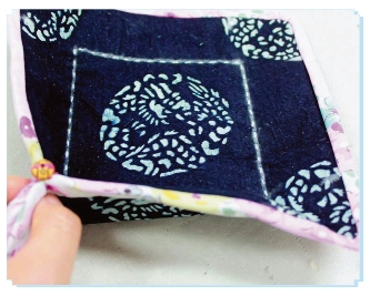 1.图5—2:剪2块18厘米×18厘米的烫有粘衬的扎染布料。四角对齐,将表布与里布正面相对缝合,四角修剪成半圆形并剪牙口。