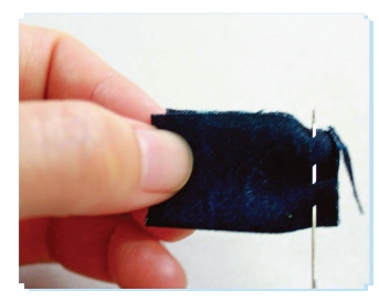 8.图5—27:剪大小为2厘米×4厘米的小扎染布一块,对折缝合。翻面后,准备20厘米麻绳,做成线轴。