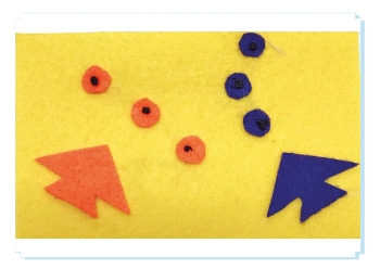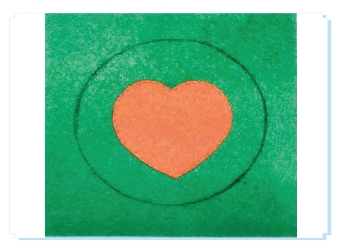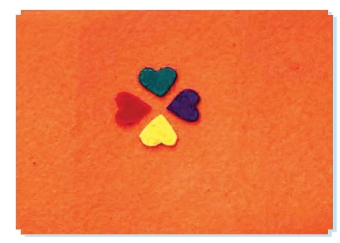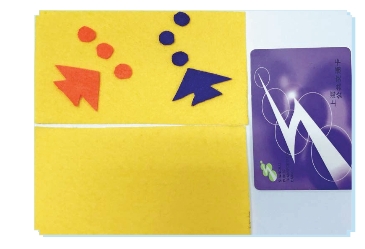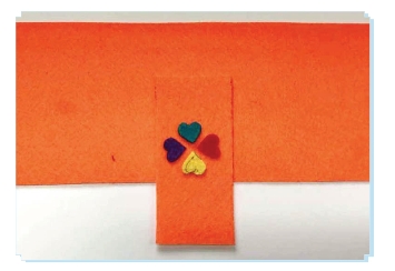 2.图6—26:剪下一块5厘米×10.5厘米的布片,再剪四个不同颜色的小心形布片,并将它放在长方形布片的中间位置。