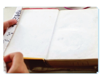 4.图6—52:将书本放入书套,将多余部分向内对折,根据书的大小做记号,抽出书本,用藏针缝合。