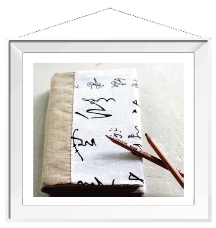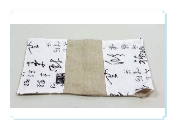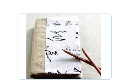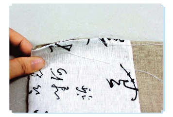 闲暇时喜欢翻翻书,可是这样几个来回,书难免会被磨损。由此给了我做麻布书衣的启示,而且仅需两片布就能完成。图6—6为古风布艺书套,麻布上清雅脱俗的几笔书法,使作品具有古朴的色彩和情韵,隔着书衣仿佛就能闻到书页的墨香……