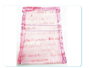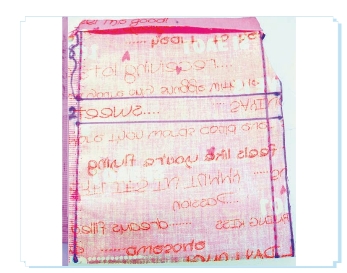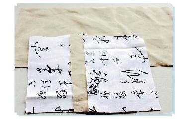 1.图6—49:裁剪表布中国书法麻布两块(11.5厘米×18厘米)、黄色麻布一块(10厘米×18厘米)、里布一块(31厘米×18厘米)。