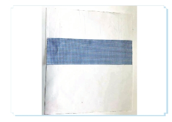 1.图6—54:裁剪一块前片涤棉布(30厘米×13厘米)、一块花棉布(30厘米×8厘米),再裁剪一块后片白色涤棉布(30厘米×20厘米)。