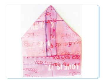 3.图6—27:自左向右7.5厘米处,用胶枪或缲针将心形布片固定在长方形布片上,尖角对尖角。