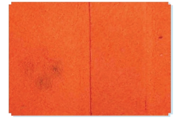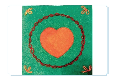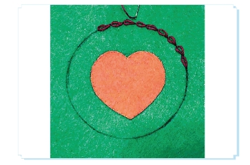 1.图6—64:裁剪一块边长为12厘米的正方形不织布片,在正方形中心位置画一个半径为4.5厘米的圆。剪一个橘红色的心形布片放在圆的中心位置。
