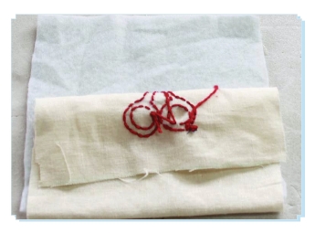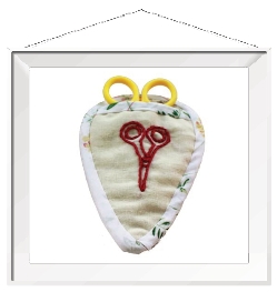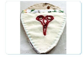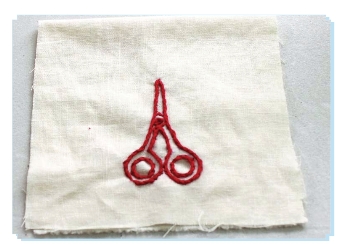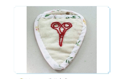 2.图6—43:采用轮廓绣在尺寸为13厘米×13厘米的麻布上绣上剪刀图案,剪刀中间部分使用打籽针缝制。