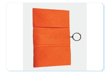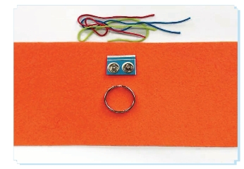 1.图6—25:制作钥匙包配件:35厘米×10.5厘米的不织布面料一块、钥匙环、揿钮、绳带。