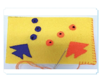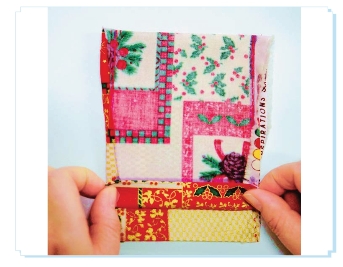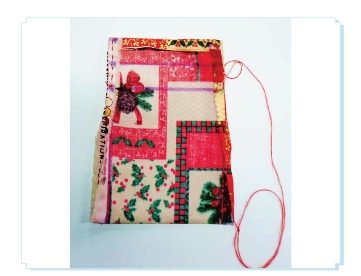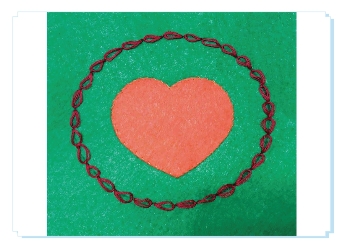 2.图6—65:用缲针将心形布片固定在正方形不织布片上。