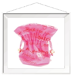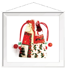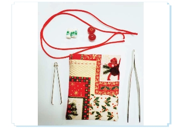 8.图6—24:翻转布袋,交叉穿绳,装上与布料颜色相配的红色珠子,作品完成。