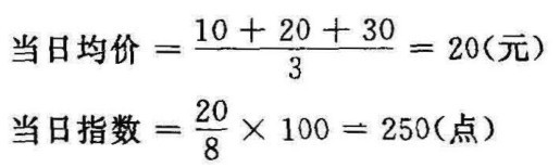 例:某股市设有A、B、C三个样本股,当日收盘价分别为10元、20元、30元,并公布A股票以1股送1股的股本变动方案,因总股本扩大1倍,其价格自然相应减少一半,次日开盘价分别为5元、20元、30元,交易一天收盘价分别为7元、20元、30元。假定该股市基期均价为8元作为指数100点,求该股市当日和次日股价均价及指数?