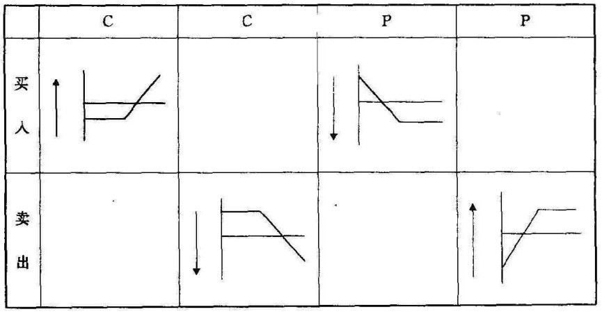 根据期权买卖的对应原理,自然还应有一个卖出看跌期权的图形。其图读者完全可依据买入看跌期权的图形推断绘出。卖出看跌期权的投资者看好后市,相信在卖出看跌期权后能稳赚期权费收入。合约规定他有义务在有效期限内无条件接受买方向他出售的以协定价格计算的一手股票,无论该股市价为多少。自然,卖方希望行情上升,能超过协定价,使买入方被迫弃权,从而能稳获期权费收入。这收入也是有限的。而亏损理论上也是有限的,即股价为零。把期权的四种情况归纳如下(见图3-4所示)。