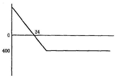 买入看跌期权图3-3显示,只要股价跌进24元,投资者开始获利,这点也称为投资盈利平衡点,即用协定价格减期权费。图显示与纵轴相交的一点应该是盈利的最大值,即股价跌至零,其数值为2 400元,这仅仅是理论上能达到的极限价格,实际上也是不可能的。投资者最大亏损仅限于400元期权费。