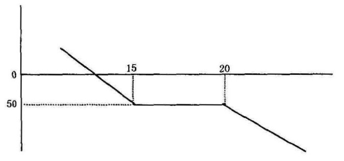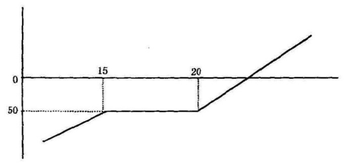 例7:某人买入一份看涨期权,协定价格20元,期权费2.50元,而该品种市价为17元。他认为市场处于牛市,人们纷纷看好该股,买入看涨期权有利可图。而且同品种的看跌期权协定价格相对较低,被执行的可能性不大。于是他又同时卖出一份同品种看跌期权,协定价格15元,期权费2元,也增加了期权费收入,两份合约到期日相同,这样,他总成本仅50元,若干天后,该股行情上升达到20元,他只能放弃第一个合约,成本250元,同时,看跌期权的买入方同样弃权,他获得收入200元,净损失就是当初总成本50元。反之,行情上升到20.50元,他执行第一个合约,使第一个合约成本降为200元,与第二个合约收入相互抵消持平,见图3-5所示。