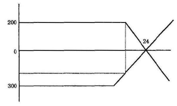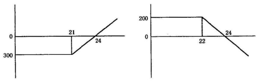 从图3-1中看出,第一个合约在价位24元时,执行结果盈利与成本相抵持平,图中穿越横轴点即是平衡点,而股价一旦跌进21元,则买方最大损失为300元,这也是他投资停损点。当股价在21元~24元之间盘整徘徊,投资者的成本则在0~300元之间相对应,即亏损额随价位增高而减少。当股价一旦冲破24元,他开始获利,随着股价不断攀升,其盈利空间是无限的。