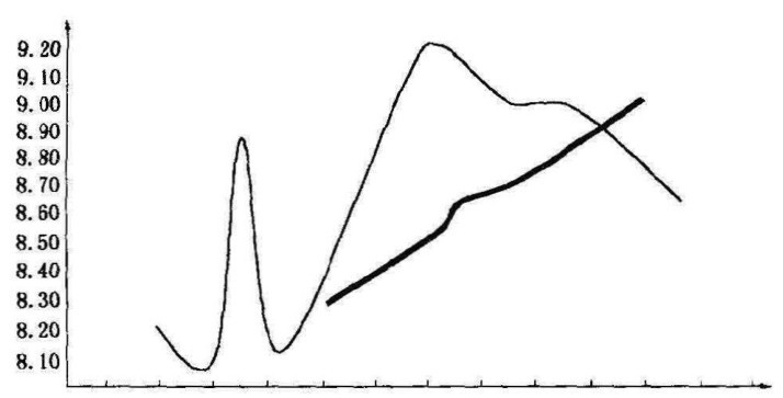 将上述数据在图表中相连成线,就形成了以5天为基期的均线:图中细线表示各收盘价的连线,粗线表示5日均线,它是在各收盘价基础上产生的。