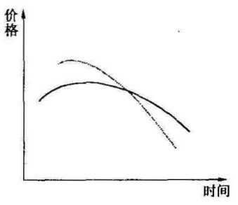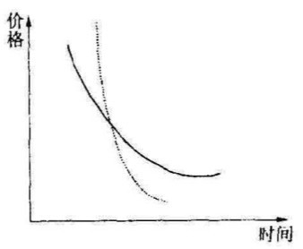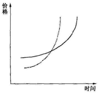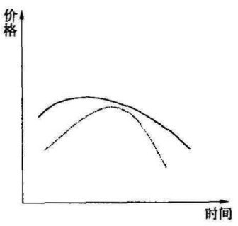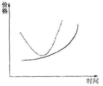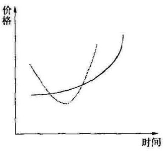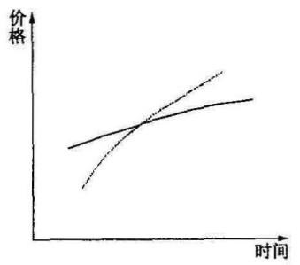 (1)均线从下降轨迹变为平坦转而呈上升趋势,而股价此时从均线下方突破并交叉向上,见图7-21,此信号即是买入信号,其前提是此时均线定要抬头向上。图中实线为均线,虚线为股价线,下同。