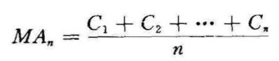 移动平均线的计算非常简单,先设定一定数量的交易日(n天)将各个收盘价依次相加,采用算术平均数得出n天的平均股价,第n+1天的平均值是在原有n天收盘价之和上,加上第n+1天的收盘价,并减去最前一天的收盘价,然后再除以n得出。如此循环,每天不断增加新的资料数据,剔除旧的资料数据,滚动前进,始终保持n个交易日的稳定数据资料,得出每日以n为基期的均值。