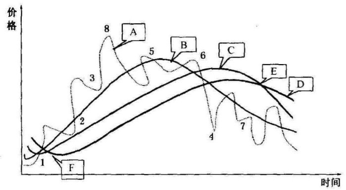 把这八个图形连接起来,就是葛兰维尔法则。根据不同时间长度与均线之间的关系,可以从两方面进行分析:一是注意各种移动均线的方向性,二是注意各种移动均线的交叉性。如图7-29所示,A是股价线,B是短期均线,C是中期均线,D是长期均线,1 8是上述八个独立图形的连接,E是死亡交叉,F是黄金交叉。