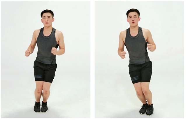标准的高抬腿动作需要在保持上身挺直状态的前提下,将腿抬升至水平位置(图2-3)。高抬腿是一个简单的有氧运动,亦是常见的热身方式之一。高抬腿的动作能够有效地提升下部肌肉群的蹬抬能力,强化下部肌肉锻炼的效果。