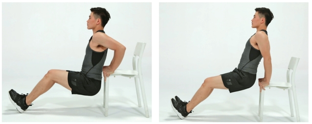可以借助凳子等支撑物进行锻炼。双臂撑在椅子上,双脚撑地,身体其他部位则悬空,慢慢弯曲肘部,身体下沉,直至上臂与小臂呈直角,此过程是吸气的状态;然后,利用双臂肱三头肌收缩的力量慢慢撑起身体,保持呼气状态,直至双臂撑起,停顿1~2秒。然后,重复以上动作(图3-2)。